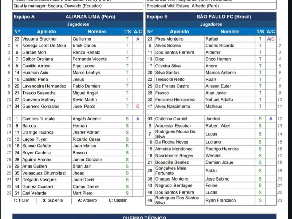 El once titular de Alianza Lima contra Sao Paulo: Viscarra; Huamán, Noriega, Garcés, Trauco; J. Castillo, Lavandeira, Gaibor; Quevedo, E. Castillo y Paolo Guerrero.