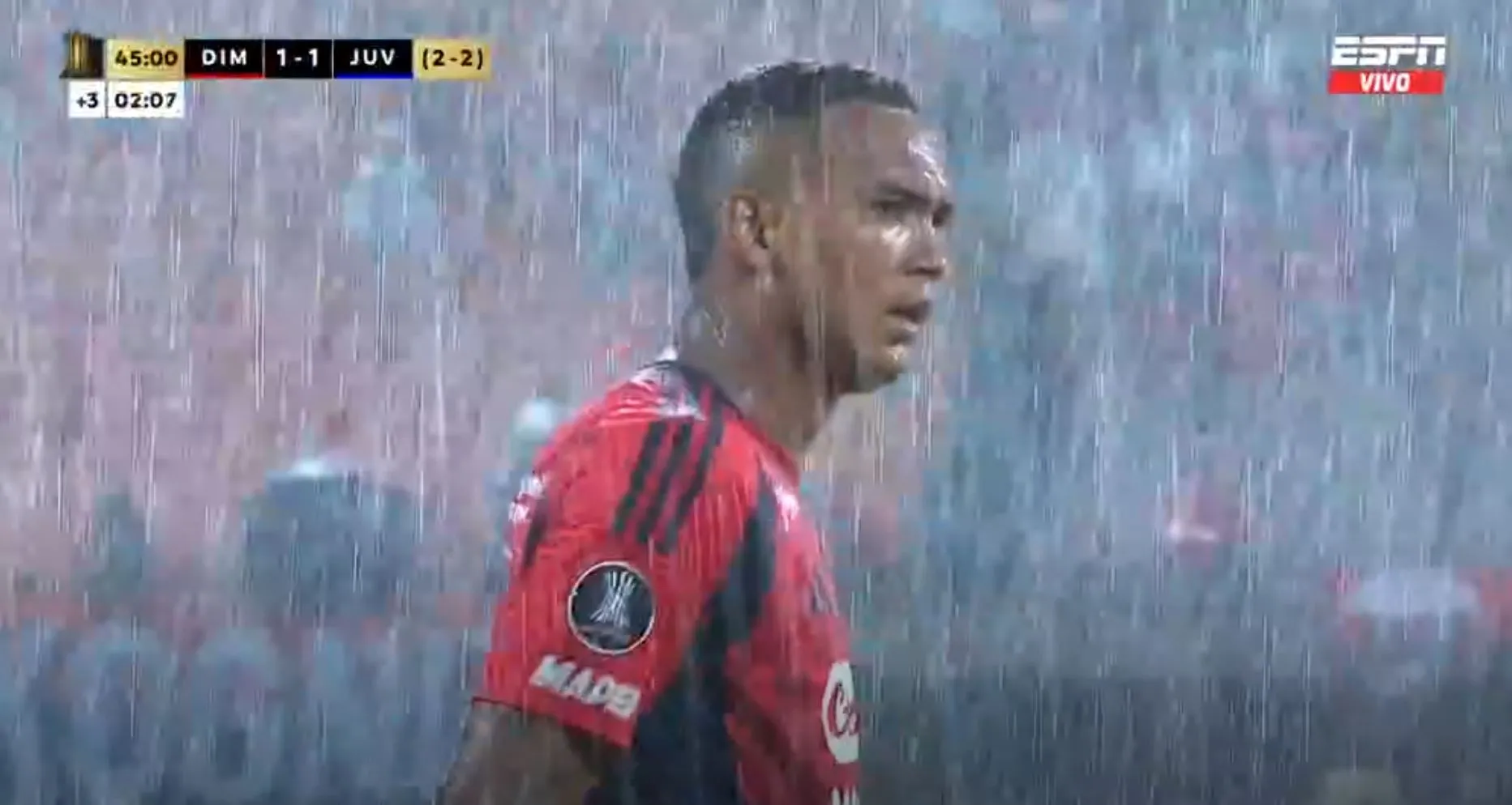 Quizá no se note en la transmisión, pero que las personas externas al partido tengan protección contra lluvia indica que todavía sigue.