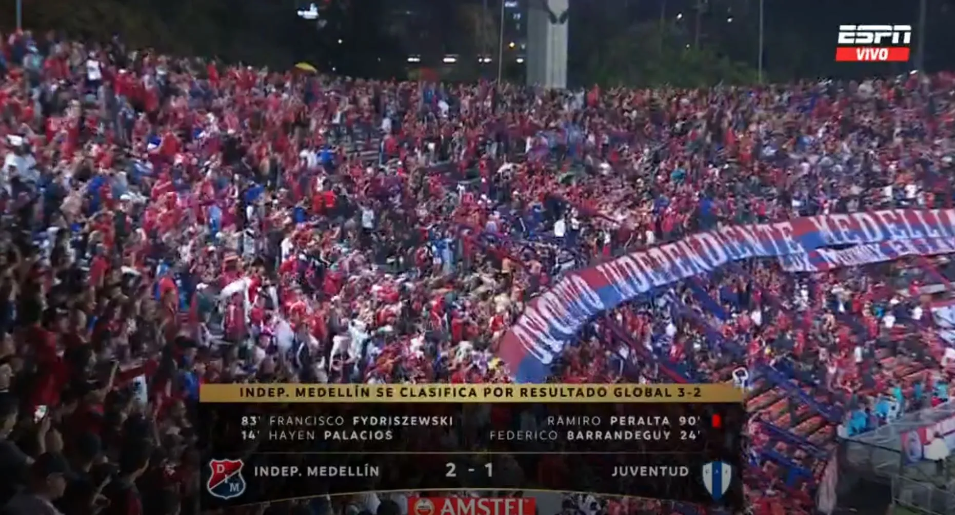 Hayen Palacios, que se vistió de centrodelantero, anota el primero para Medellín ante Juventud y, al menos por ahora, asegura el pase a la fase de grupos de la Libertadores. Así son los números, muestran algo, pero la realidad a veces es otra. Golazo y el local se agranda.