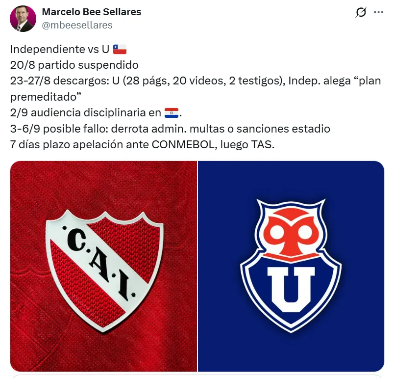 Después de la emisión del fallo, ambos equipos implicados tendrán un plazo de 7 días para presentar su apelación ante Conmebol. En caso de no estar conformes con la decisión tomada, podrían recurrir al Tribunal de Arbitraje Deportivo (TAS).