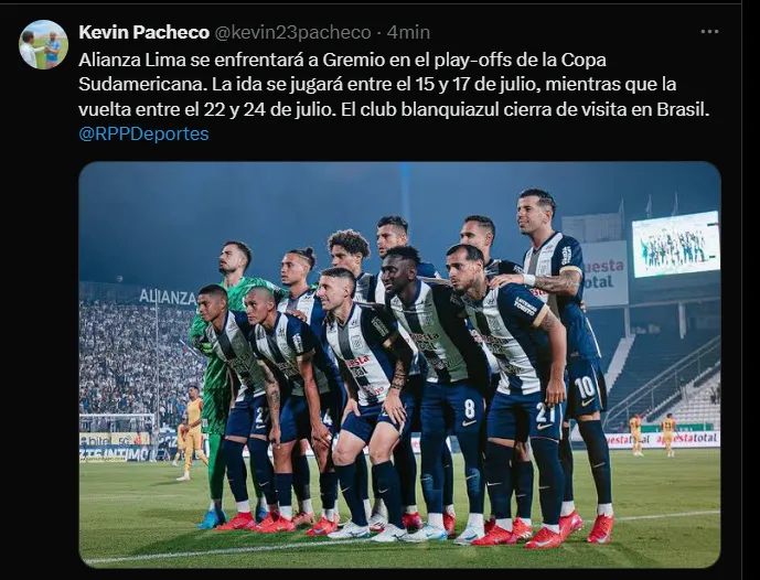 De acuerdo a una reciente información del comunicador deportivo Kevin Pacheco, podemos conocer que las fechas tentativas para la llave entre Alianza Lima vs. Gremio de Porto Alegre por los 16vos de final de la Copa Sudamericana 2025 serían entre los días 15/17 de julio en el marco del partido de ida en Matute y 22/24 de julio pensando en el duelo de vuelta en el Arena do Grêmio.