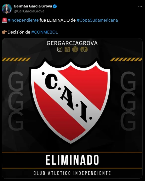 Tal como adelantó Bolavip ya se conoce el veredicto final de parte de la Conmebol. Que es eliminar a Independiente según pudo dar a conocer Germán García Grova en sus redes sociales.