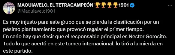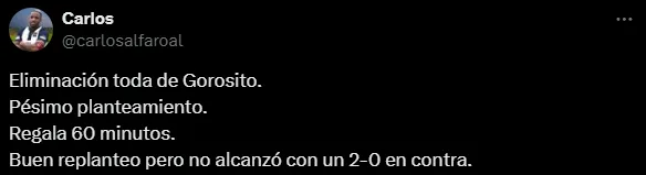 “Es muy injusto para este grupo que se pierda la clasificación por un pésimo planteamiento que provocó regalar el primer tiempo. En serio hay que decir que el responsable principal es Nestor Gorosito“, escribió también otro hincha blanquiazul.