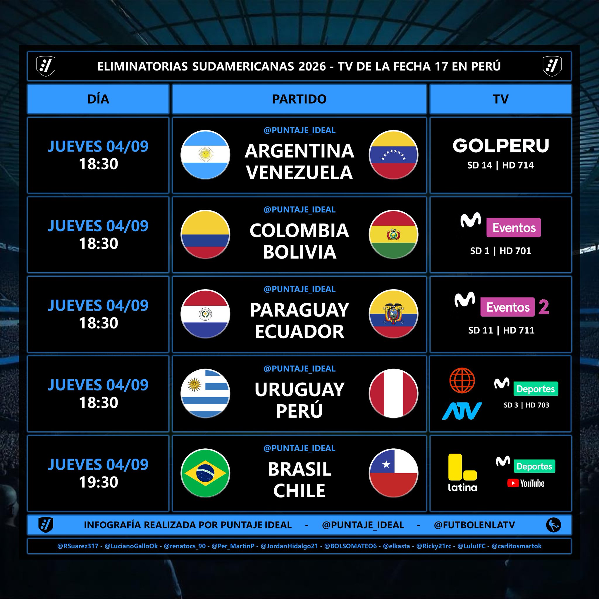 Para poder ver en vivo y en directo todos los partidos oficiales de la fecha 17 de las Eliminatorias Sudamericanas, lo podrás hacer desde Perú a través de la señal oficial de GOLPERU, Movistar Deportes y Latina.
