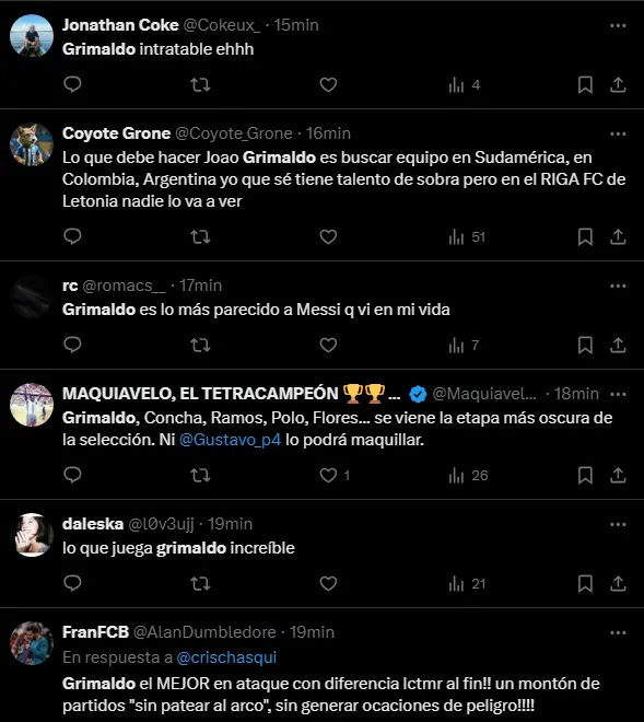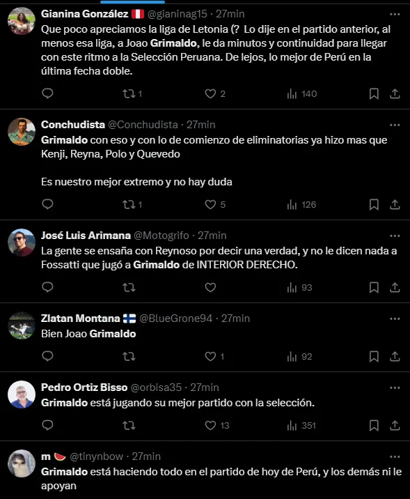 Los aficionados no dudaron en halagar el gran rendimiento de Joao Grimaldo en este encuentro. Lo vieron como un jugador importante que fue el único que dio la cara por el Perú. Pues otros jugadores experimentados no estuvieron a la altura de este encuentro.