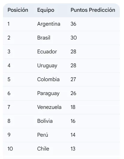 Entonces, siempre según la predicción de la IA, los clasificados al Mundial por Sudamérica serían Argentina, Brasil, Ecuador, Uruguay, Colombia y Paraguay, mientras que Venezuela se quedaría con el puesto del repechaje.