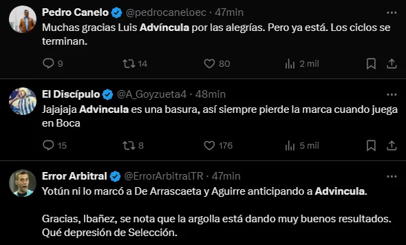 Los hinchas han sido bastante críticos con el desempeño de Luis Advíncula. Se nota que no está en su mejor nivel y por eso varios ya piden que se dejen de argollas. Pues consideran que debería dejar la Selección Peruana. También dejan en claro que en Boca es suplente por algo y en estas Eliminatorias Rumbo al Mundial 2026 lo demostró.