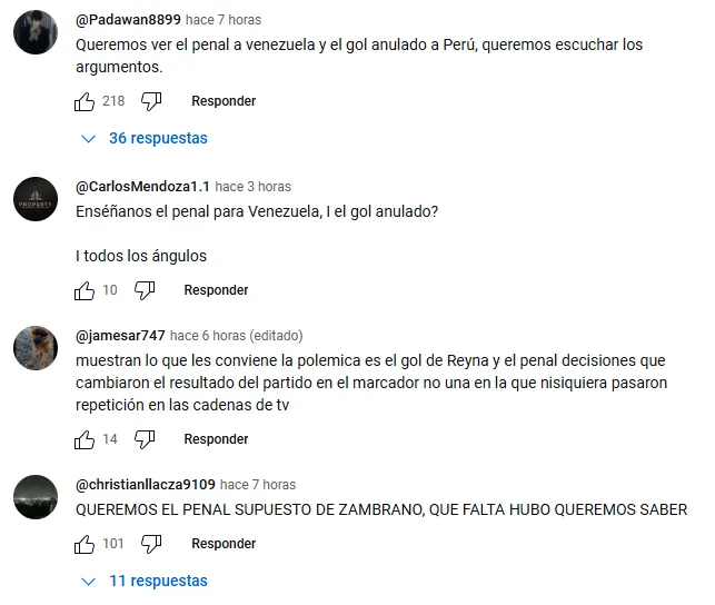 A raíz de que CONMEBOL ignoró todas estas jugadas y no las mostró en la revisión VAR en su canal de YouTube, los hinchas de Perú explotaron y no dudaron en quejarse por no mostrar estas acciones. “Muestran lo que les conviene” y “queremos ver el penal a Venezuela y el gol anulado a Perú“, fueron algunos de los comentarios que se pueden ver en dicho video.
