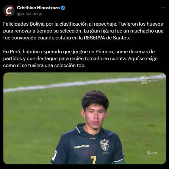 El claro ejemplo es Miguel Terceros, que pasó de ser un jugador que nadie conocía, a uno de los referentes más importantes de Bolivia. Su convocatoria se dio jugando en el equipo de reservas de Santos y en Perú no se atreven a hacer este tipo de cambios. Se tiene a un Oliver Sonne en la Premier League, pero ni así le da para jugar de titular en Perú según Óscar Ibáñez.