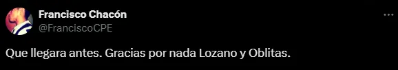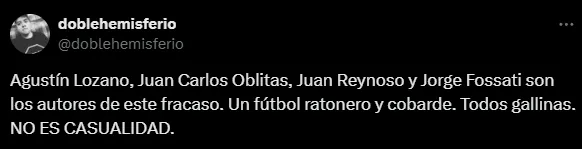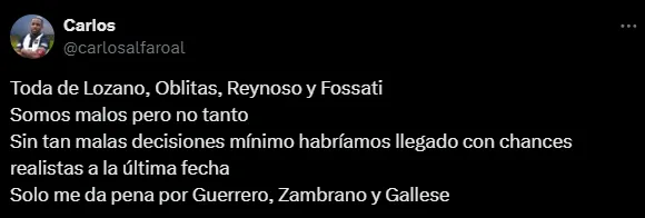 “Gracias por nada, Lozano y Oblitas“, fue uno de los mensajes que se pudo ver en X. “Toda de Lozano, Oblitas, Reynoso y Fossati. Somos malos pero no tanto. Sin tan malas decisiones mínimo habríamos llegado con chances realistas a la última fecha“, tiró otro aficionado.