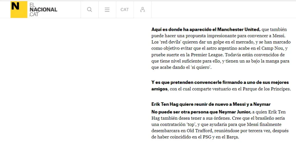 “Y tienen un as bajo la manga para que acabe dando el ‘sí quiero’. Y es que pretenden convencerle firmando a uno de sus mejores amigos, con el cual comparte vestuario en el Parque de los Príncipes. No puede ser otra persona que Neymar Junior, a quien Erik Ten Hag también desea tener a sus órdenes”, escribieron.
