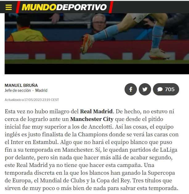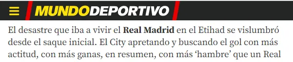 Además, la prensa catalana (mundo deportivo) también se prestó para estos acontecimientos, donde ellos aseguran que desde el pitazo inicial del encuentro entre City y Madrid, este último iba a vivir un desastre en Etihad.