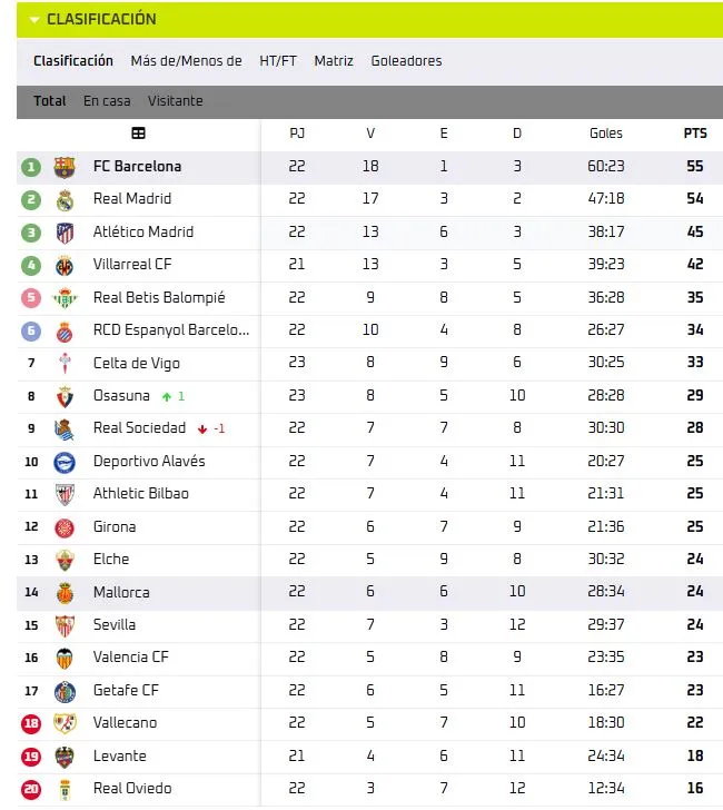 Presentamos la tabla de posiciones de LaLiga, donde se ve que el Barcelona es primero y el Mallorca ocupa la casilla 14°.