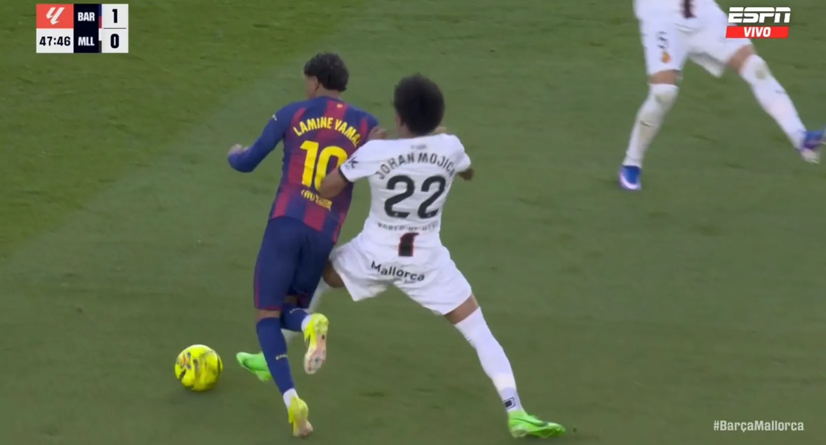 Mojica venía marcando a Yamal dentro del área y las cámaras muestran que quizá sí hubo contacto, aunque el árbitro no cobró ninguna falta.