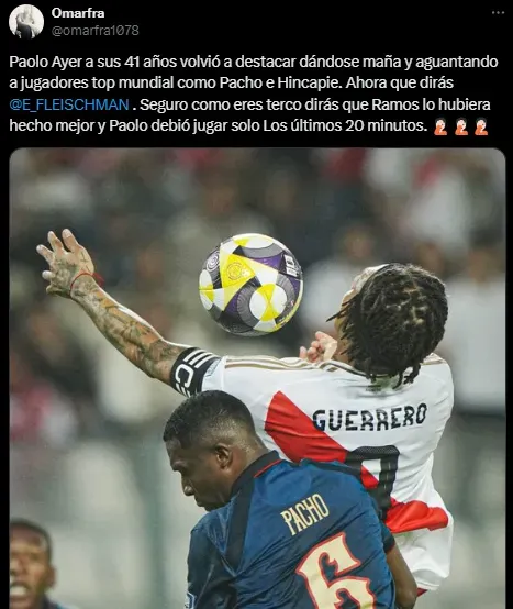 De hecho, en redes sociales, hubo varios mensajes destacados para el buen trabajo de Guerrero y en detrimento a lo de Pacho, pero sobre todo, Hincapié. “Con 41 años, no lo hizo mal ante Pacho y Hincapié“, tiró Aldo Martínez de El Comercio.