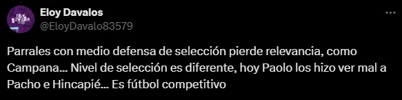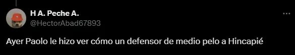 En tanto, hubo hinchas que tiraron: “Ayer Paolo le hizo ver cómo un defensor de medio pelo a Hincapié“, “ese campeón de Champions (por Pacho) sufrió contra Paolo, Hincapié simplemente reventaba el balón” o “Paolo los hizo ver mal a Pacho e Hincapié“, entre otros comentarios.