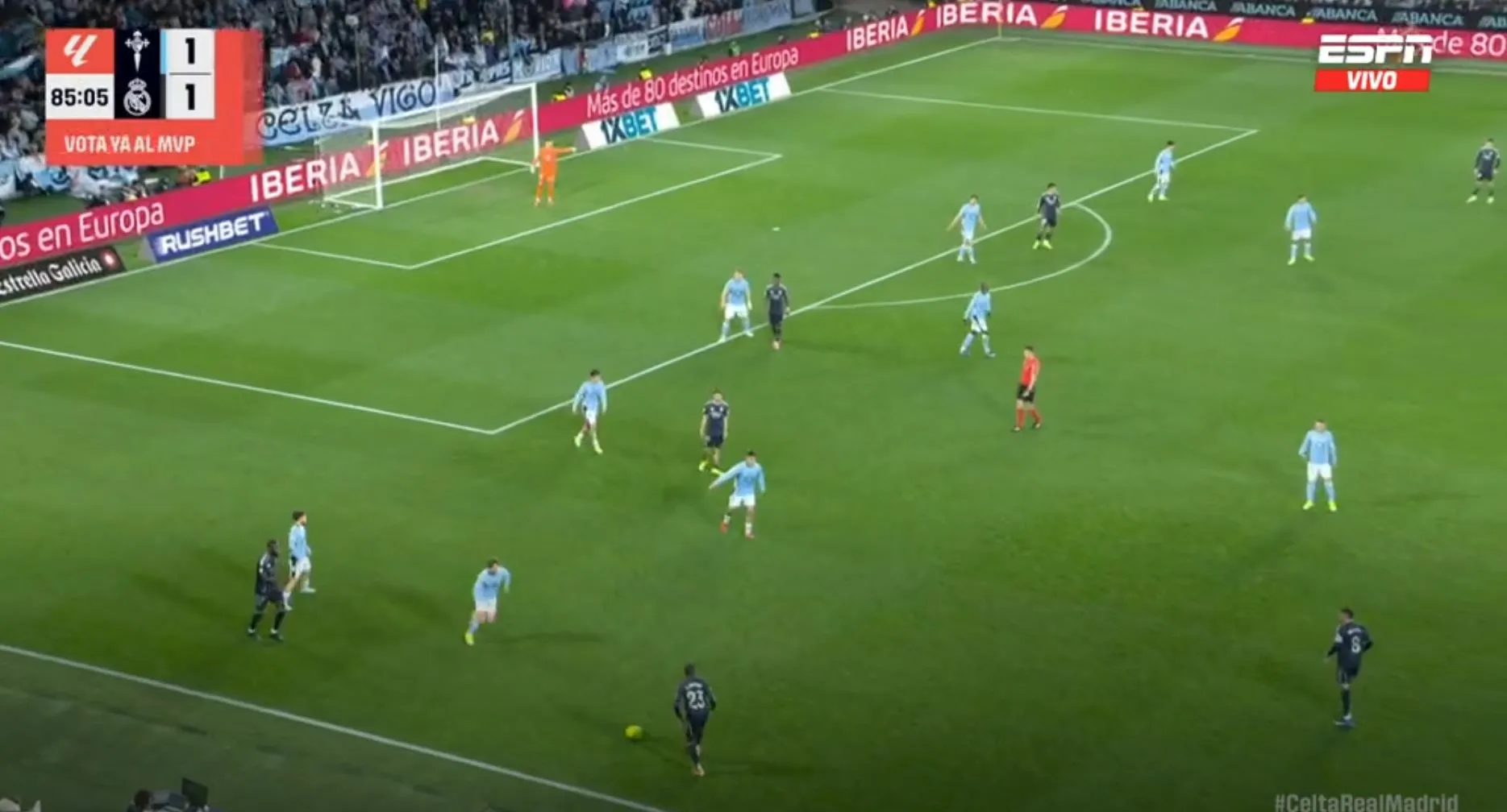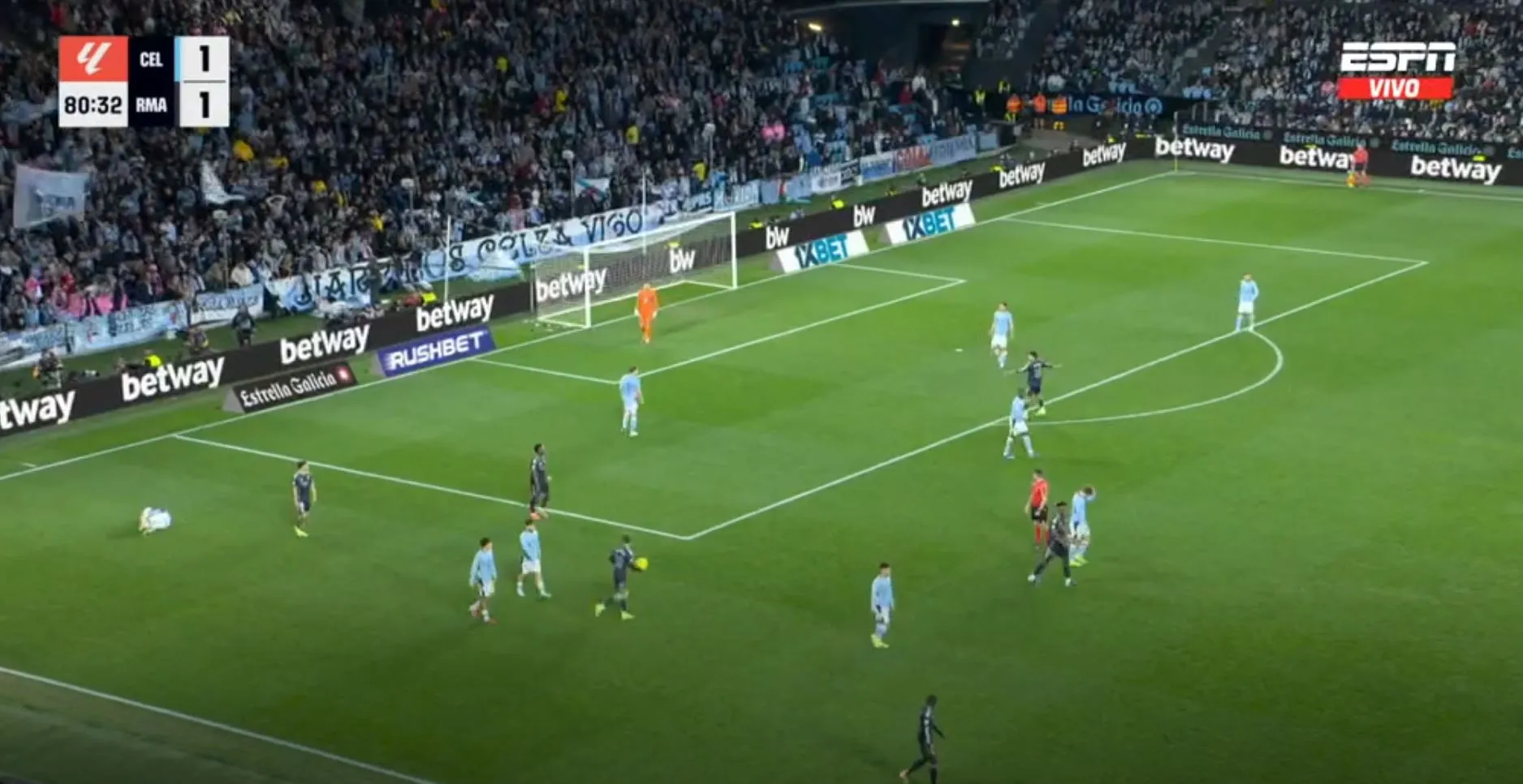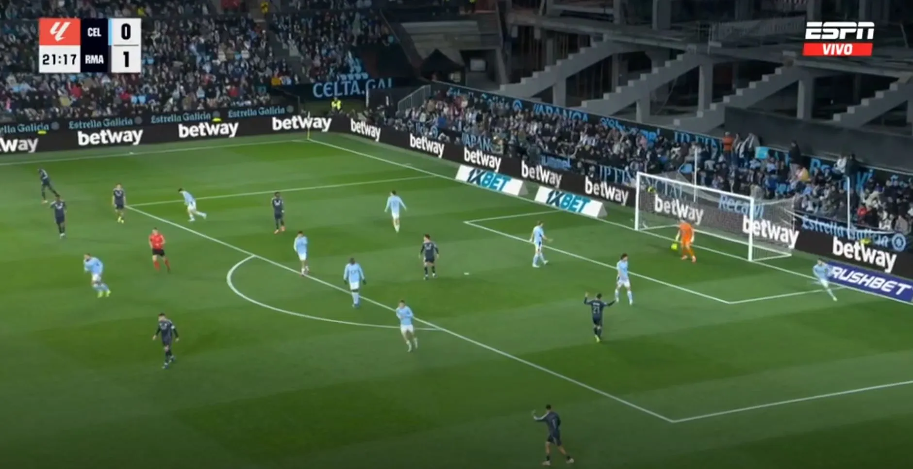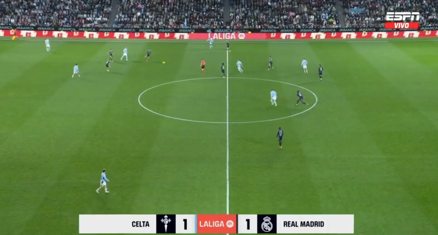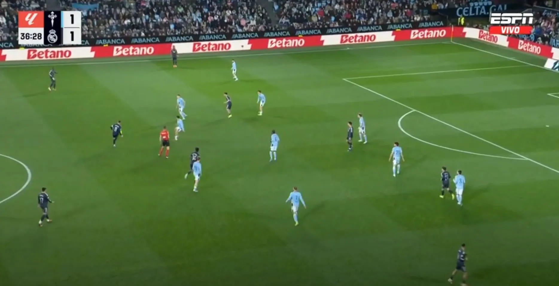 Así terminó el primer tiempo, con un gol para cada uno, pero con la sensación que Celta podría hacer más daño si se ponía serio y que Madrid peleaba contra sus propias limitaciones. No fue hasta los instantes finales cuando Federico Valverde, más por empuje que por táctica, remató, la pelota se desvió e ingresó al arco del local.