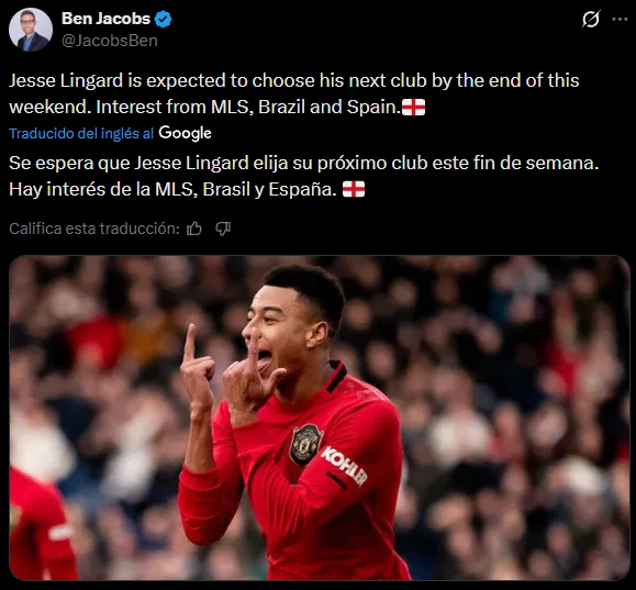 Durante las primeras horas de este jueves 26 de febrero, el periodista Ben Jacobs reveló que Lingard debía tomar una decisión respecto a su futuro profesional para fines de esta semana. Brasil, MLS y el fútbol de España apuntaban como posibles destinos.