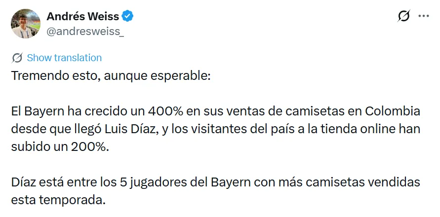 Según los datos revelados, el Bayern Múnich ha experimentado un incremento del 400% en la venta de camisetas en Colombia desde la incorporación de Luis Díaz. Este notable aumento refleja el fuerte arraigo y la influencia que tiene el futbolista en su país de origen.