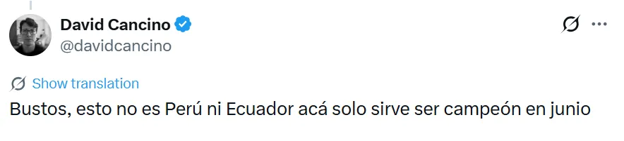 En un mismo tono de advertencia, se leyeron comentarios como “Bustos, esto no es Perú ni Ecuador acá solo sirve ser campeón en junio”, “Fabián Bustos, una cosa simple y sencilla: SOLO SIRVE SER CAMPEÓN” y “Señor Bustos: 4 de marzo es su objetivo a corto plazo, quedar campeón igual”, reflejando la presión inmediata que tendrá el nuevo DT desde su primer día en el cargo.