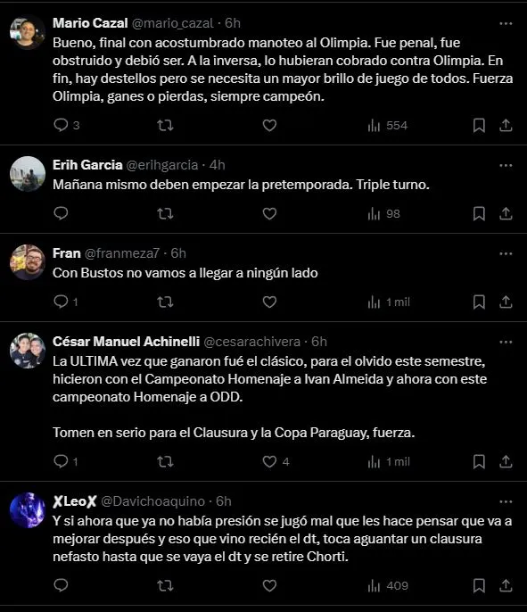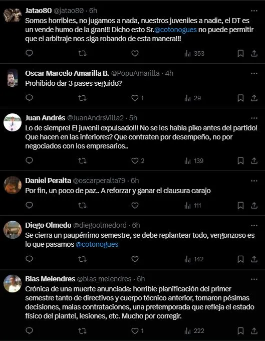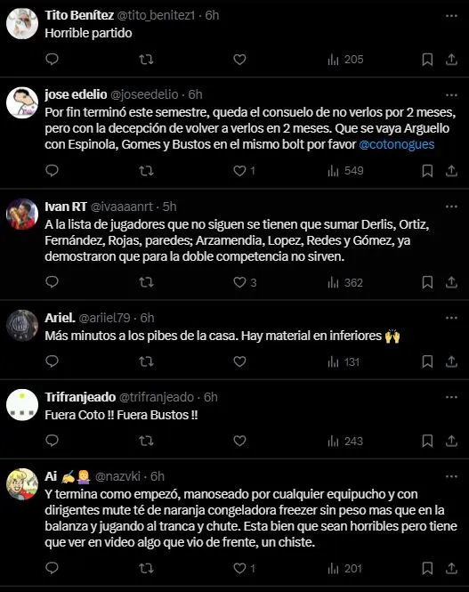 Otra facción de la afición, si bien también insatisfecha, opta por una visión más pragmática. Demandan que Fabián Bustos se mantenga en el cargo, pero bajo la condición de que realice cambios drásticos en el plantel. Lo cual termina siendo una medida de urgencia, que no gusta del todo. Pero es lo más cercano que pasará según podemos entender.