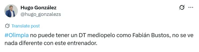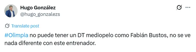 “Fabián Bustos la pasa terriblemente mal en Paraguay, pasó de estar en el ‘paraíso’ a un infierno grande”, “Fabián Bustos se va a ir antes de la fecha 4, lamentable como el equipo sigue sin jugar a nada”, “Olimpia no puede tener un DT mediopelo como Fabián Bustos“, “Con Fabián Bustos no iremos en ningún lado”, “Fabián Bustos sigue perdido como DT de Olimpia”, “Se tiene que ir Bustos, no tiene idea de juego, no tiene nada. Ni si viene CR7 se mejora con él“, fueron algunos de los comentarios en redes.