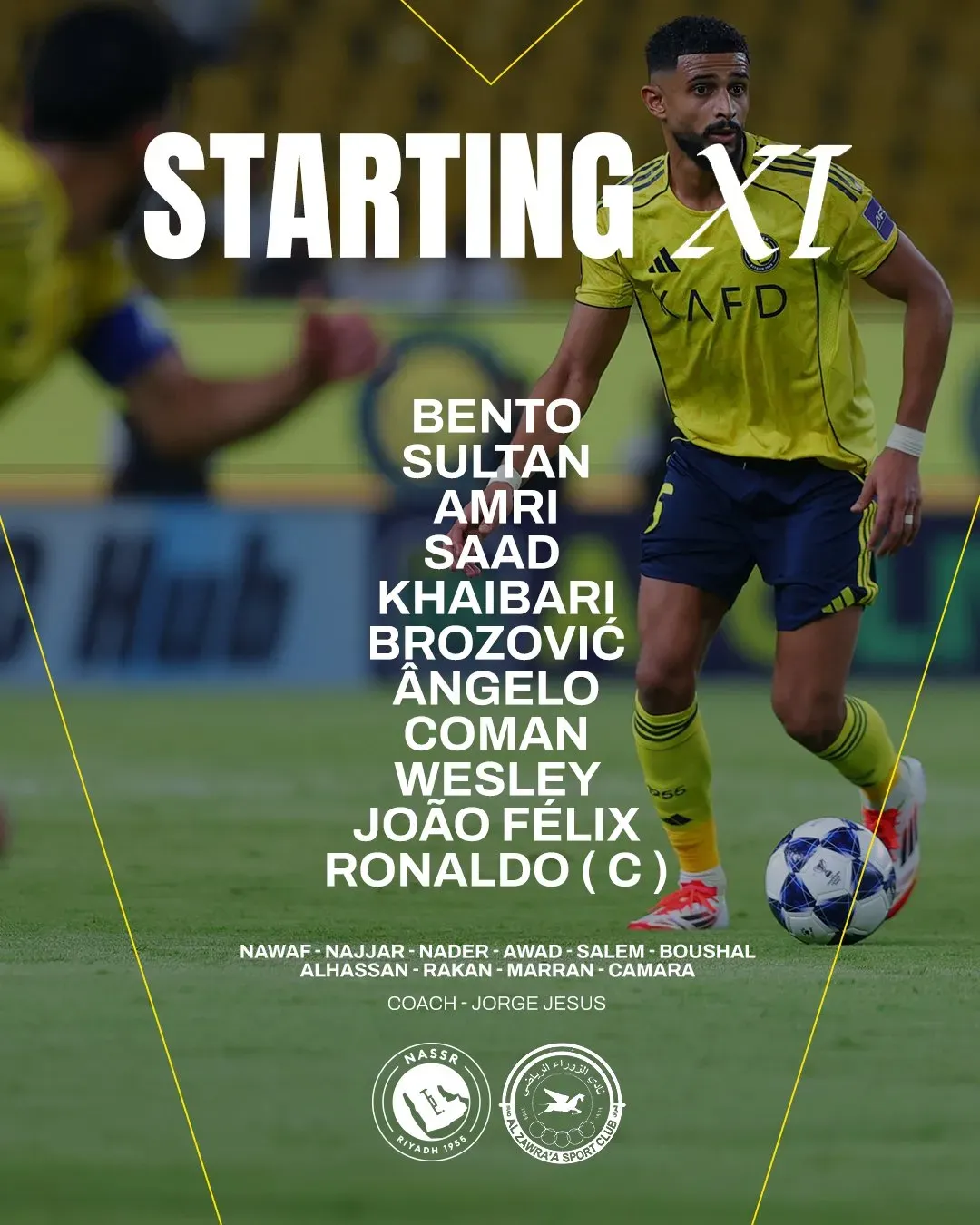 - Al Nassr: Bento; Sultan Al Ghannam, Mohamed Simakan, Abdulelah Al Amri, Salem Al Najdi; Angelo, Ali Al Hassan, Marcelo Brozovic, Wesley; Joao Felix y Cristiano Ronaldo. DT: Jorge Jesus.