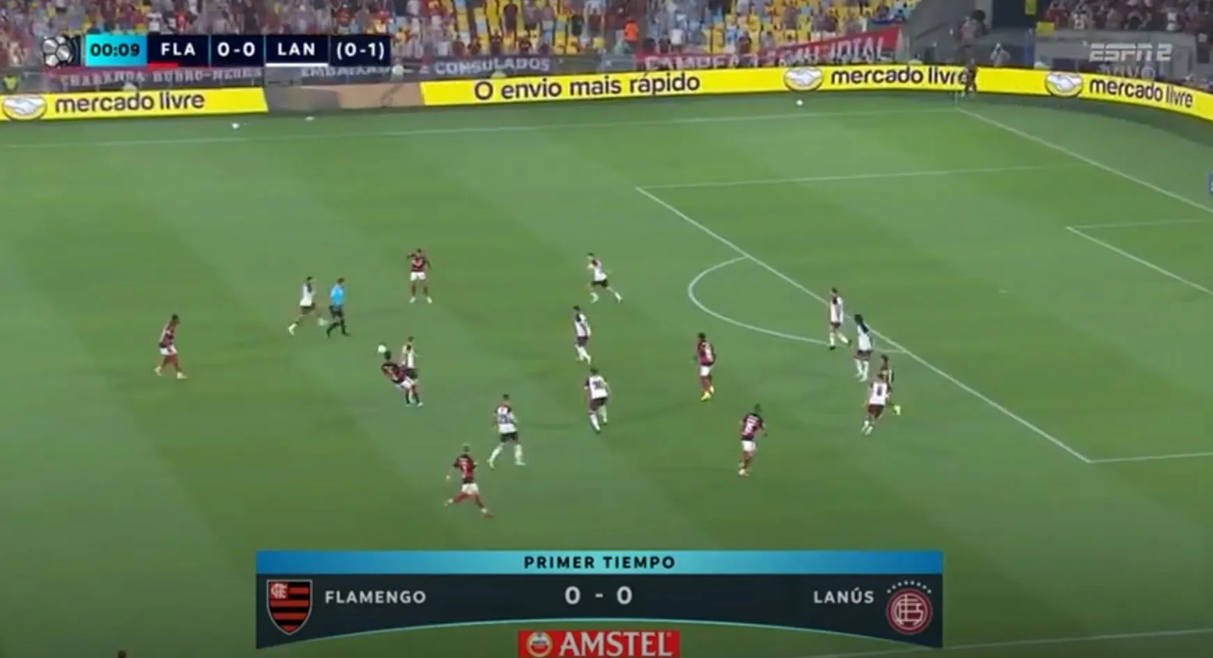En el inicio del partido, Flamengo se muestra muy nervioso, falla pases y no tiene buena conexión entre sus jugadores. Situación muy diferente en Lanús, donde todos están concentrados, corren por cada balón y presionan para recuperar la pelota.
