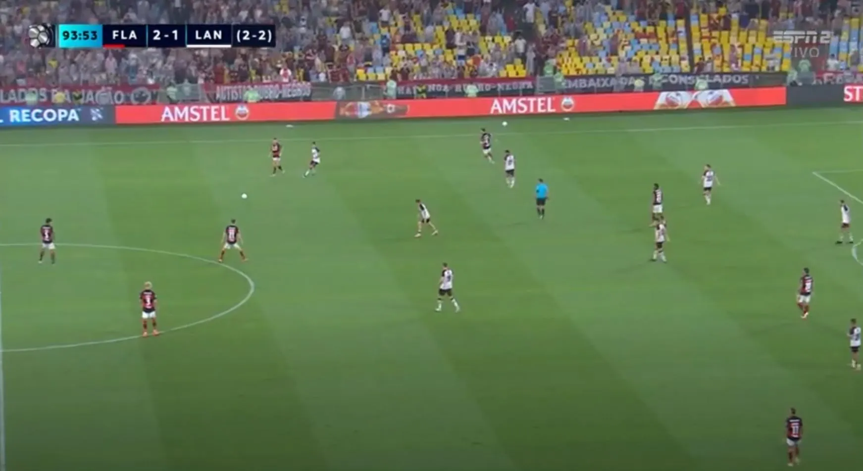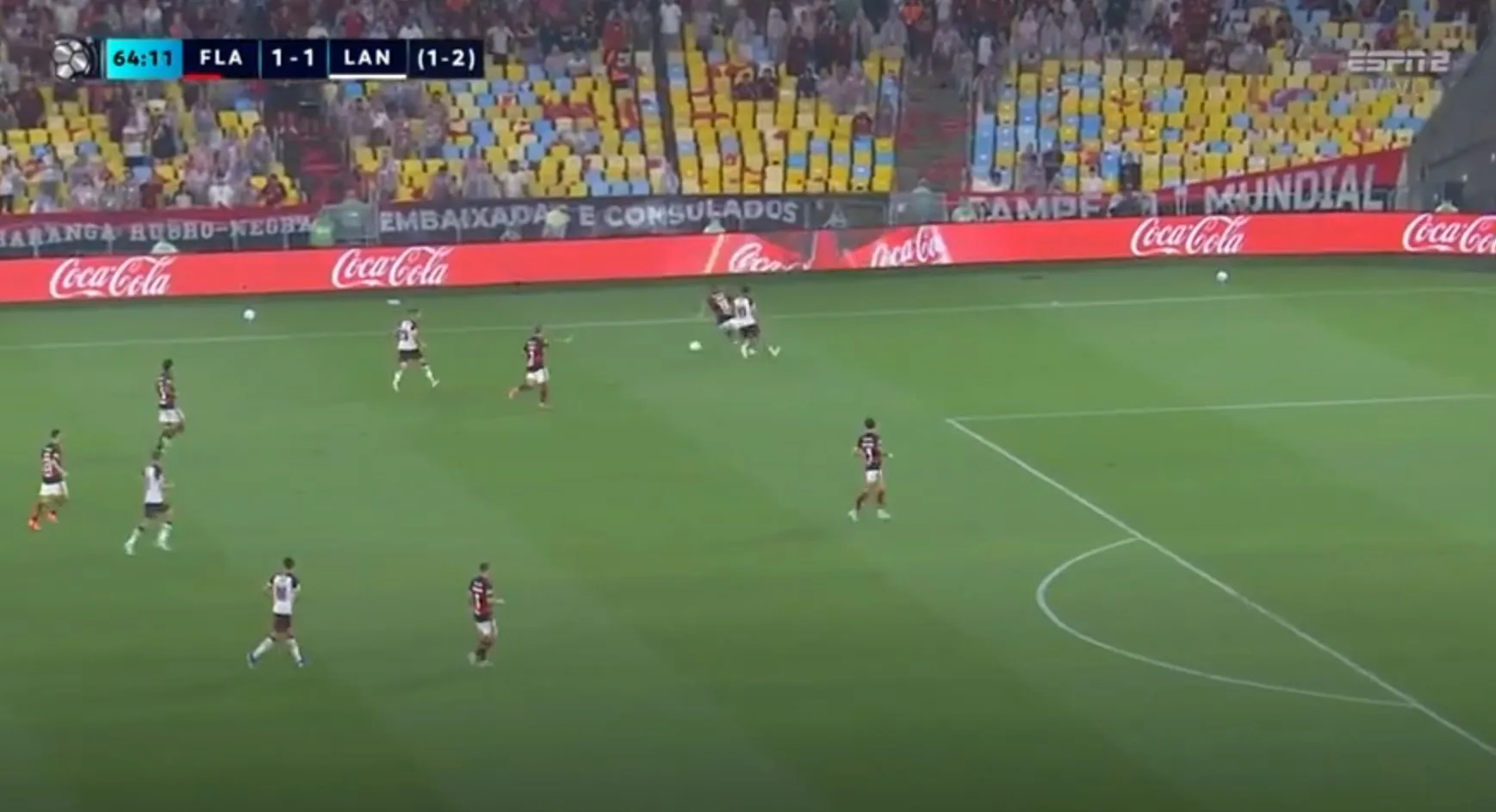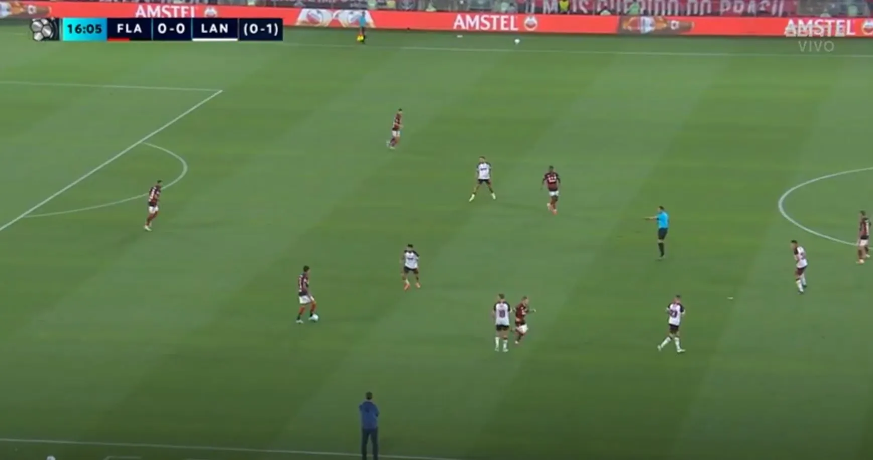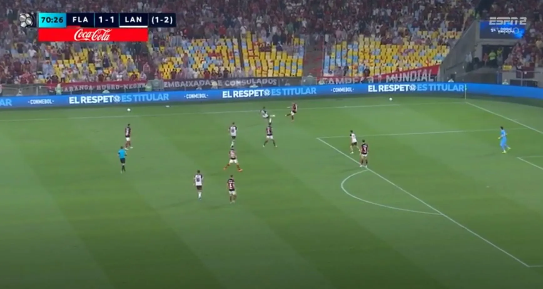 Ahora sí Lanús solo resiste los ataques de Flamengo y la línea de los jugadores están por completo detrás de la del balón.