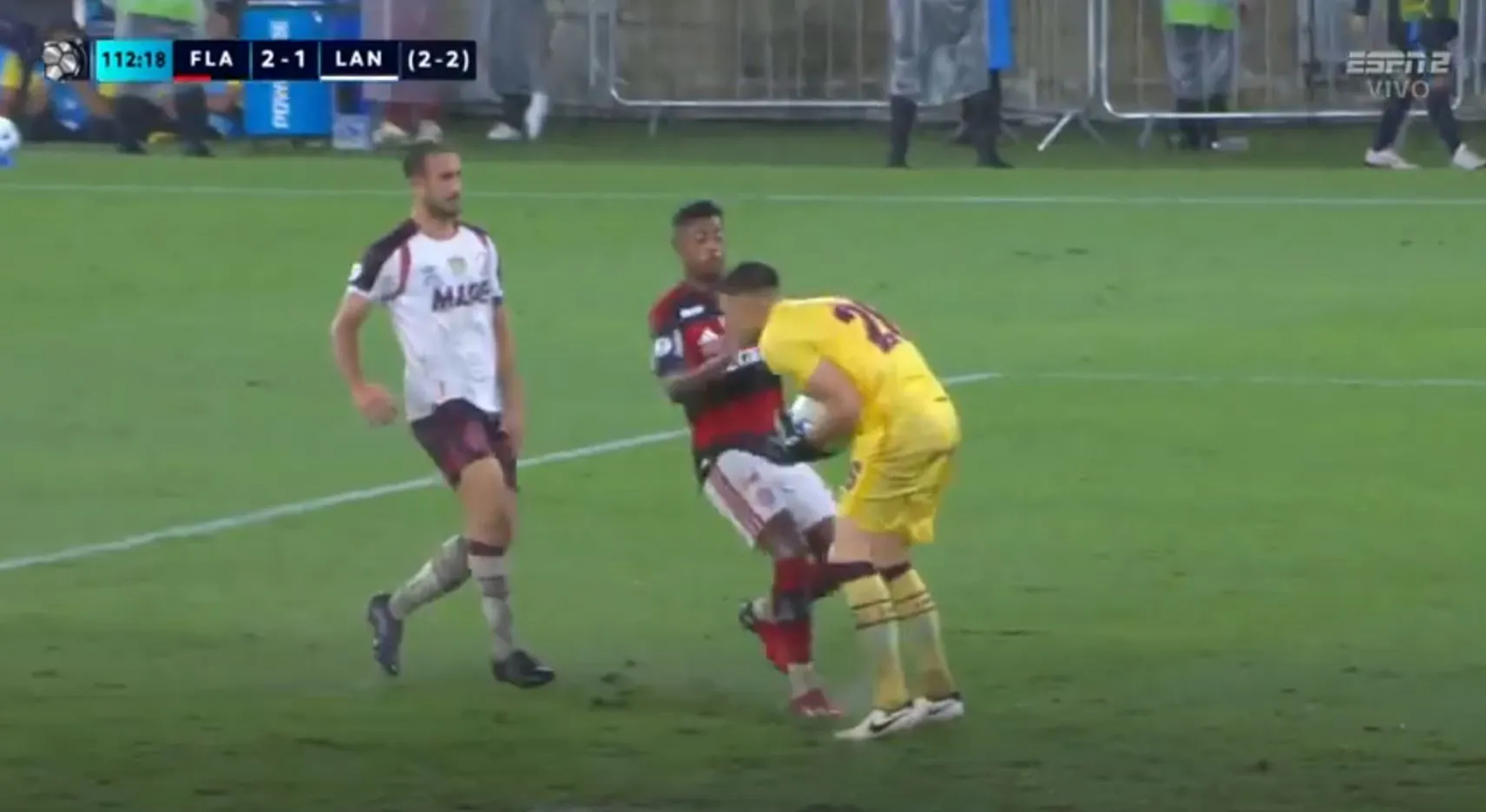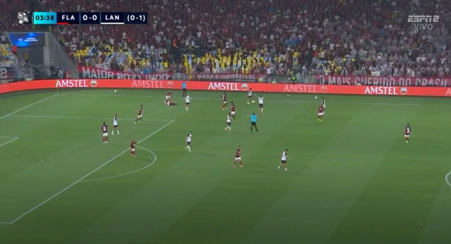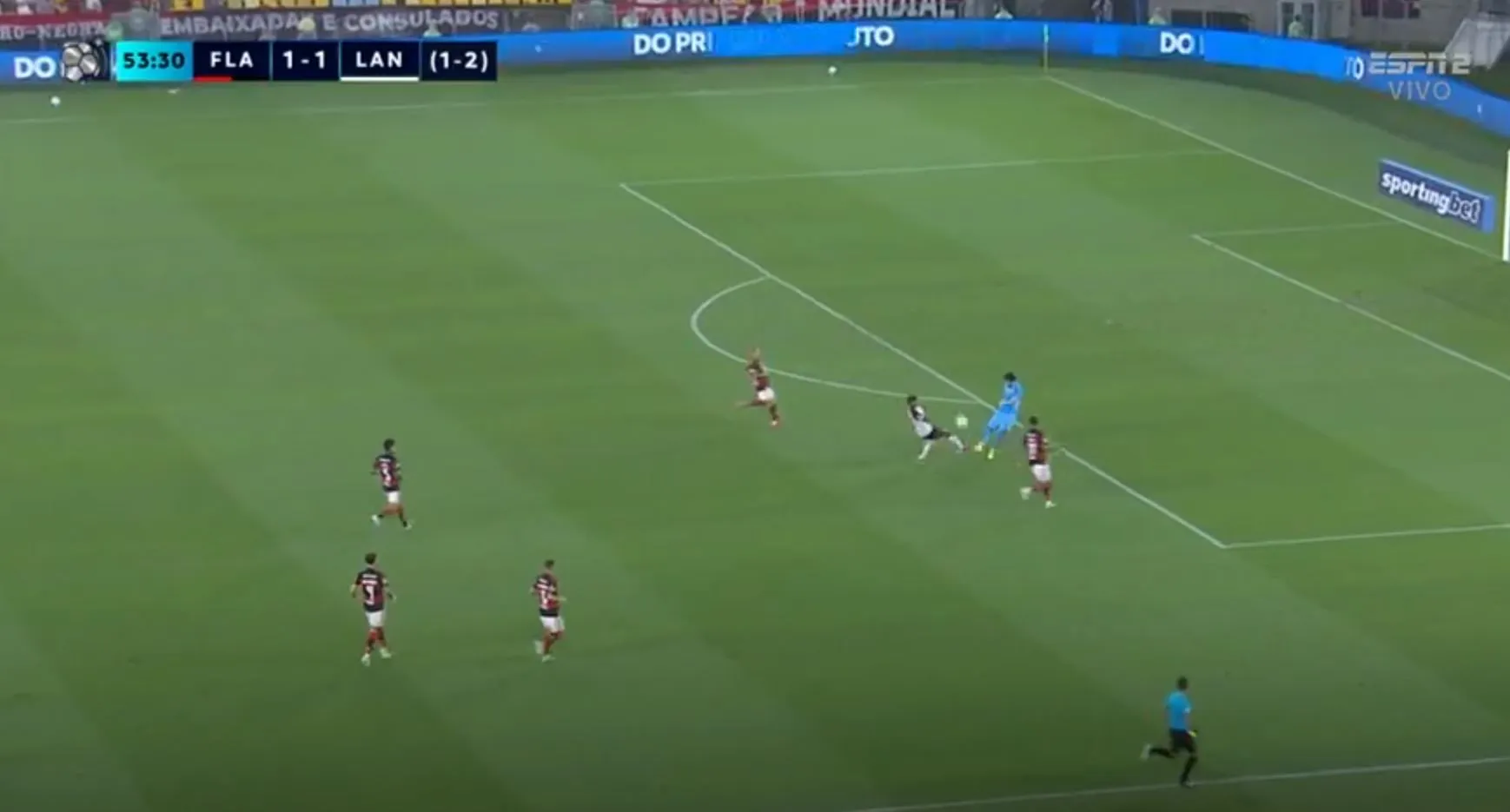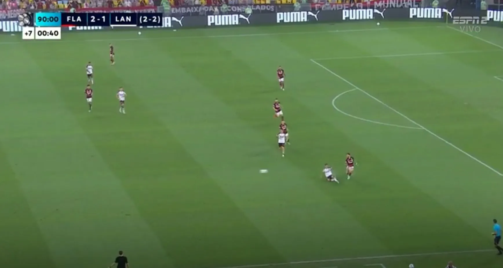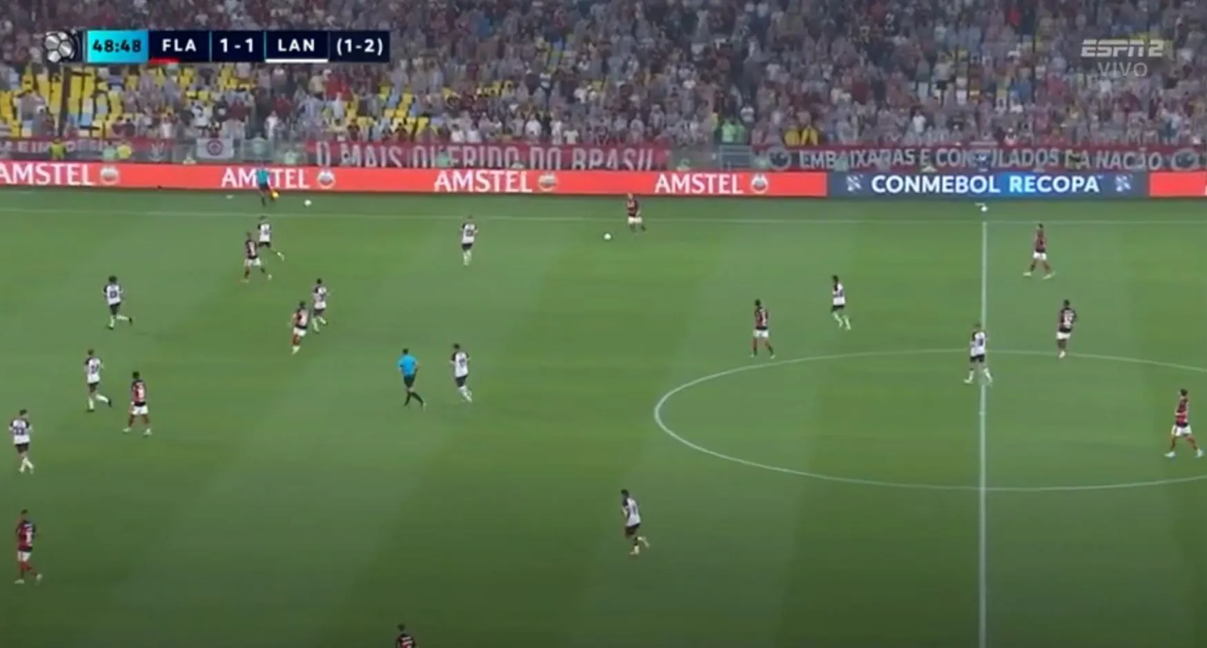Ahora sí Lanús solo resiste los ataques de Flamengo y la línea de los jugadores están por completo detrás de la del balón.