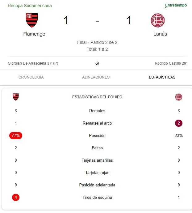 Es momento de ver las estadísticas del partido entre Flamengo vs. Lanús, a instantes de empezar con el complemento.