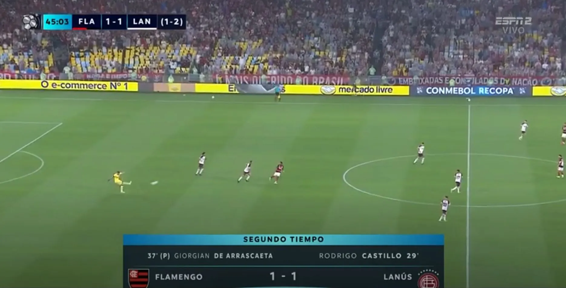 Terminó la mitad inicial y Lanús con Flamengo igualan 1-1 por la vuelta de la final de la Recopa Sudamericana.