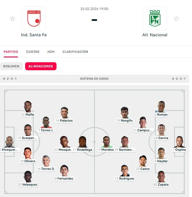 Santa Fe confirmó su once titular para el partido ante Atlético Nacional por la fecha 5 de la Liga BetPlay 2026: Marmolejo; Palacios, Olivera, Scarpetta, Mafla; J. Torres, D. Torres, Velásquez, Fernández; Mosquera y Rodallega.