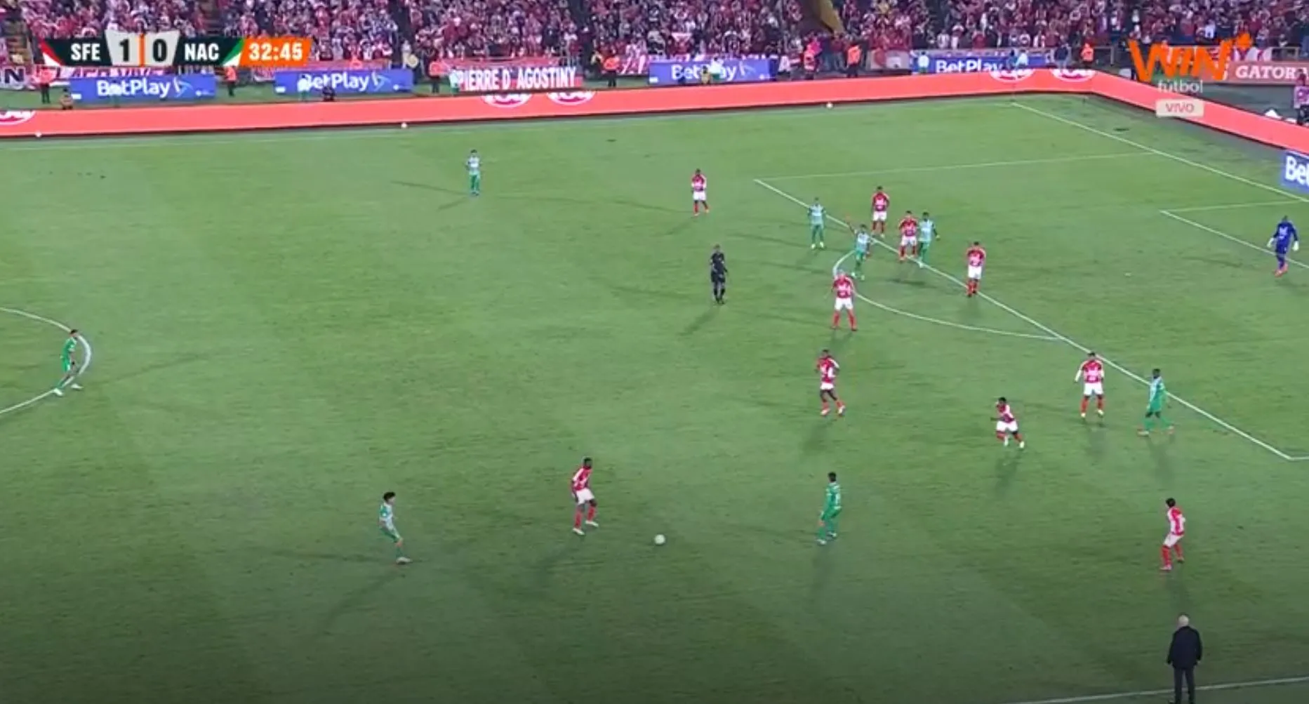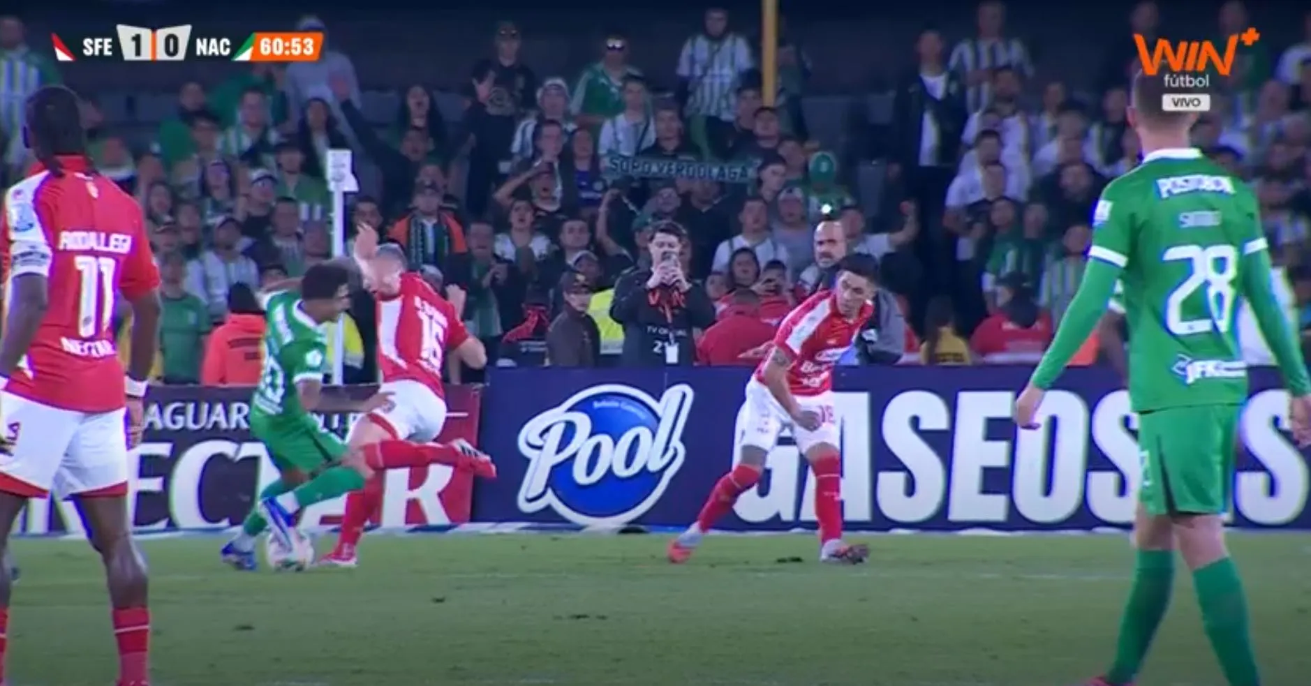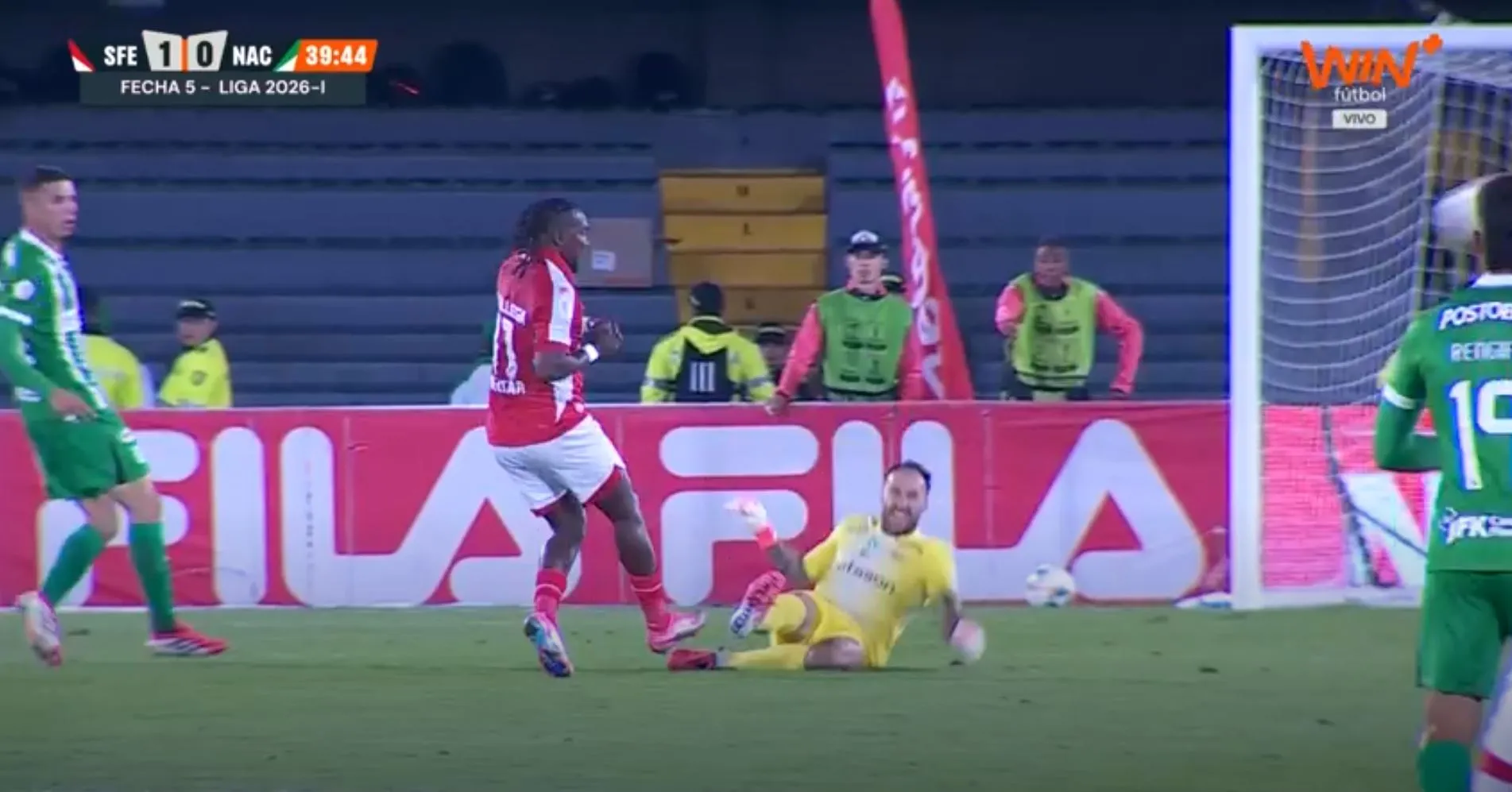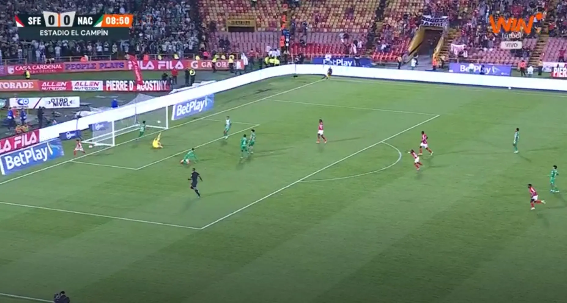 Atlético Nacional buscaba el tercero del partido, pero el balón se fue cerca del palo. Seguimos 2-1 a favor del 'Verde' en el Campín ante Santa Fe.