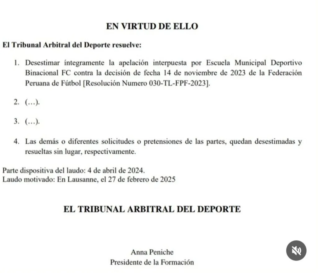 En su cuenta de Twitter, explicó Gustavo Peralta la realidad hasta el momento: “Deportivo Binacional volvió a primera división como consecuencia de una decisión del Poder Judicial que la FPF tuvo que acatar. Hoy se conoció que el TAS rechazó la apelación del club de Juliaca confirmando la resolución del tribunal de Licencias de la Federación. Sin embargo, eso no es lo que obliga a descender automáticamente (de forma administrativa) a Binacional que está amparado en una cuestión judicial”.