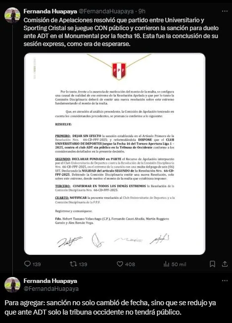 Todo empezó con la información que soltó como primicia Gustavo Peralta en su cuenta de Twitter, donde mencionó lo que pasaría esta noche en el Estadio Monumental: “CONFIRMADO: El Tribunal de Apelaciones de la FPF dictaminó que el Universitario vs. Sporting Cristal se jugará con público. El partido sin la tribuna occidente será ante ADT en la fecha 16”.