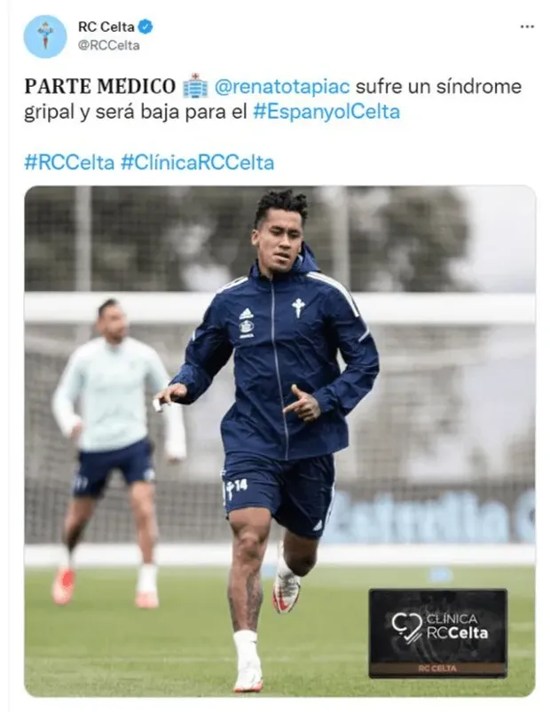 Eldepartamento médico de Celta de Vigo informó este sábado, que Renato Tapia no sería tomado en cuenta para el partido contra Espanyol, duelo que se jugará este domingo en Barcelona, por la fecha 31 de LaLiga. Como se recuerda, el peruanojugó los últimos 18 minutos en la derrota de Celta de Vigo (2-1) frente a Real Madrid, en la fecha pasada, por lo que se esperaba que tenga más continuidad.