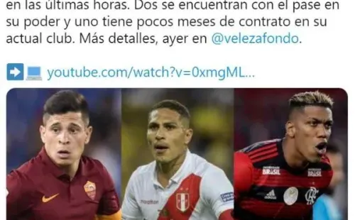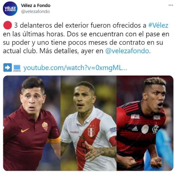 “3 delanteros del exterior fueron ofrecidos a Vélez en las últimas horas. Dos se encuentran con el pase en su poder y uno tiene pocos meses de contrato en su actual club”, escribieron en Vélez a fondo, cuenta partidaria de twitter.