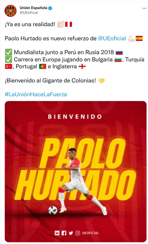 “¡Ya es una realidad! Paolo Hurtado es nuevo refuerzo de Unión Española! Mundialista junto a Perú en Rusia 2018; Carrera en Europa jugando en Bulgaria, Turquía, Portugal e Inglaterra ¡Bienvenido al Gigante de Colonias!”, escribieron justamente recordando su participación en la última Copa del Mundo.