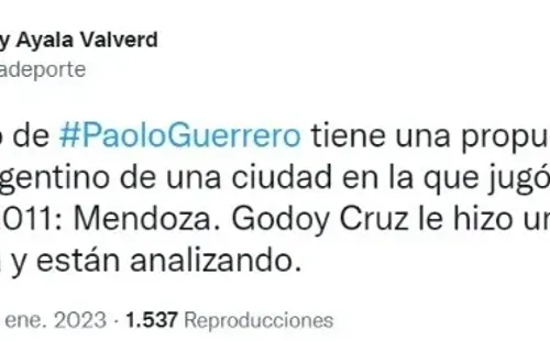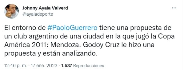 “El entorno de Paolo Guerrero tiene una propuesta de un club argentino de una cudad en la que jugó la Copa América 2011: Mendoza. Godoy Cruz le hizo una propuesta y están analizando”, comentó el periodista Johnny Ayala en su cuenta de Twitter.