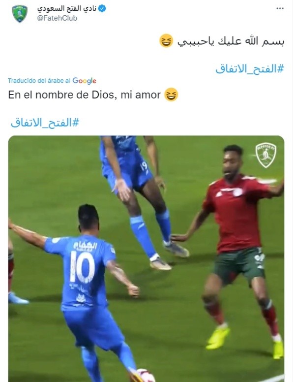 Tras el gran momento que viene mostrando Christian Cueva con el Al Fateh, el club publicó en sus redes sociales los siguiente: “En el nombre de Dios, mi amor”, fue lo que puso el conjunto de Arabia Saudita, poniendo el segundo gol del volante peruano, el cual es uno de sus mejores goles desde su llegada al conjunto del Medio Oriente.