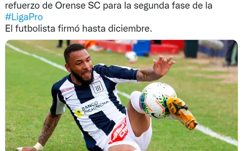“Alexi Gómez, extremo peruano de 29 años es el nuevo refuerzo de Orense SC para la segunda fase de la Liga Pro El futbolista firmó hasta diciembre”, reveló el periodista Ariel Suárez de DirecTV Ecuador en su cuenta de Twitter.