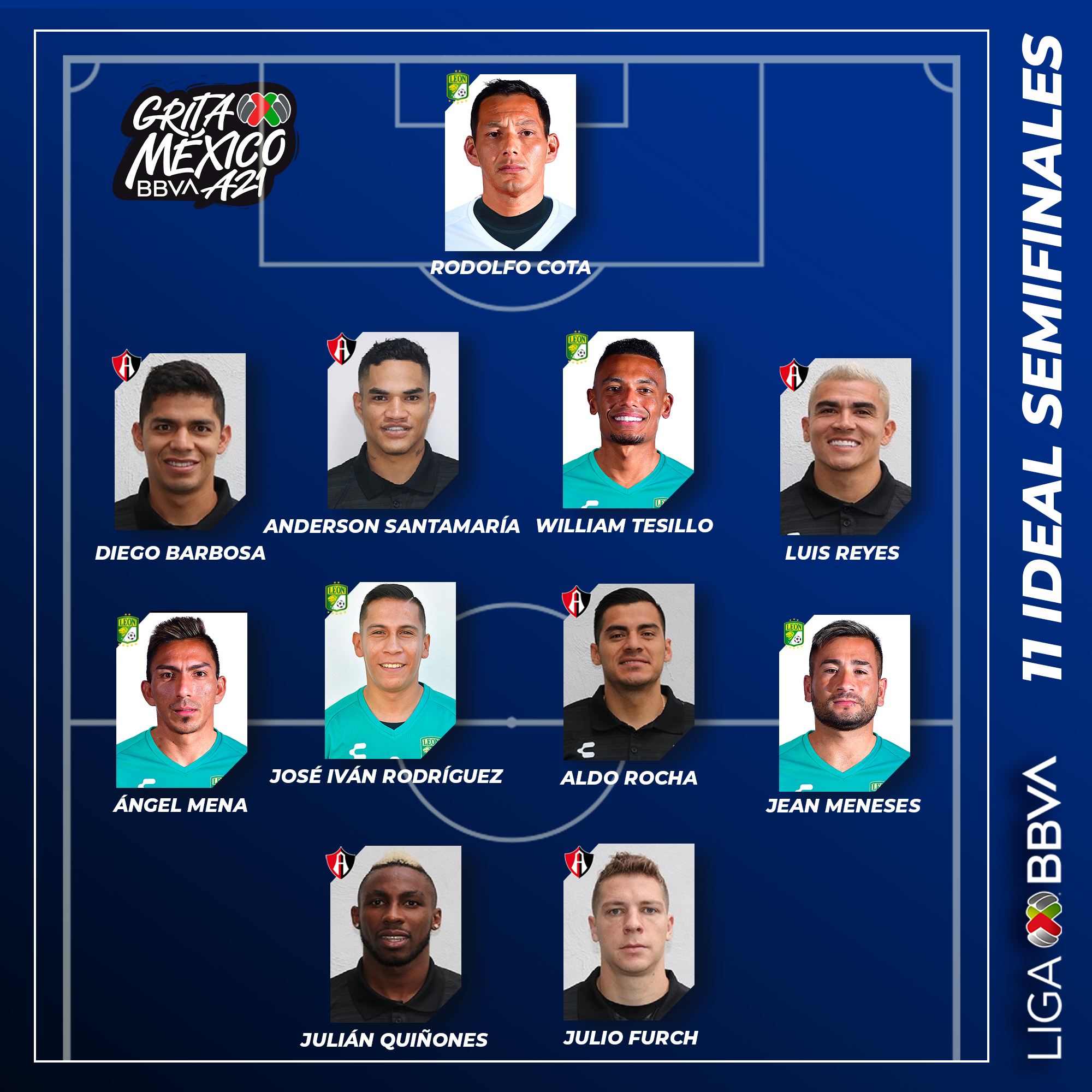 Este fue el equipo ideal para la Liga MX: Rodolfo Cota (León FC), Diego Barbosa (Atlas), Anderson Santamaría (Atlas), William Tesillo (León FC), Luis Reyes (Atlas), Ángel Mena (León FC), José Iván Rodríguez (León FC), Aldo Rocha (Atlas), Jean Meneses (León FC), Julián Quiñones (Atlas), Julio Furch (Atlas).