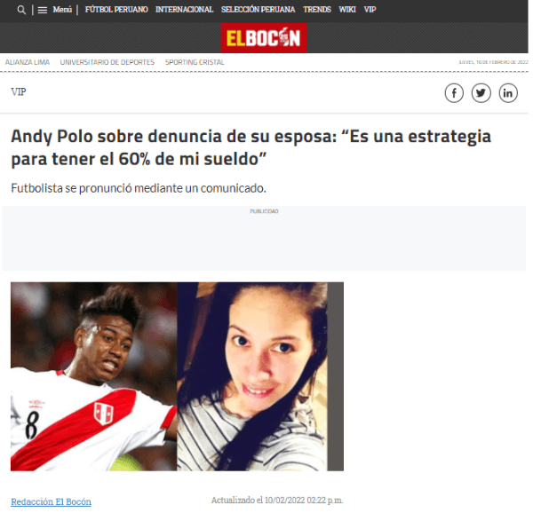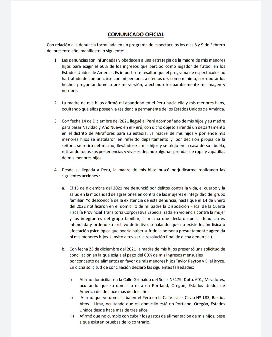 Según recogió en principio ‘El Bocón’, parte editorial del medio de comunicación, esta es la posición del ex Universitario de Deportes: “Las denuncias son una estrategia de la madre de mis menores hijos para exigir el 60% de los ingresos que percibo como jugador de fútbol en los Estados Unidos de América”.