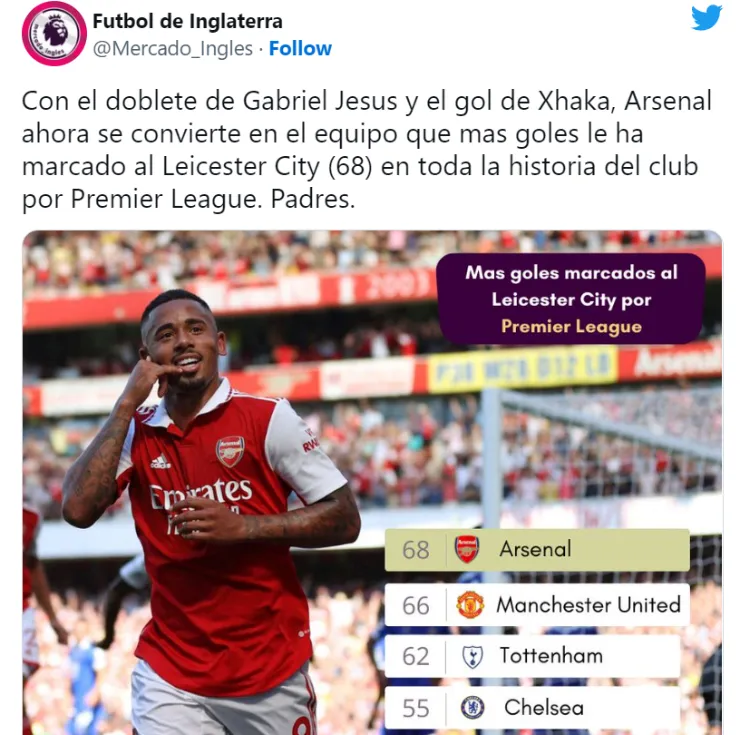 Arsenal venció 4-2al Leicestery consiguió su segundo triunfo consecutivo en el arranque de la Premier League 2022-2023. Un triunfo donde Gabriel Jesús se hizo presente en el marcador al anotar un doblete en los primeros 45′, y luego Xhaka aumente la cuenta en la segunda mitad, parael triunfo de los ‘Gunners’ en el Emirates Stadium.
