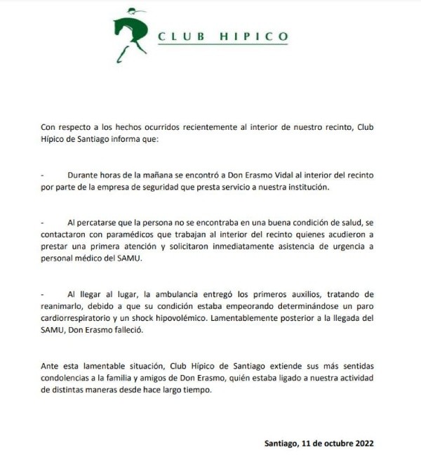 De esta manera explicó cómo se gestó el primer contacto con el papá de Arturo Vidal. Donde comentan lo que pasó, según la versión que tuvieron a primera mano, por los partes oficiales: “Durante horas de la mañana se encontró a don Erasmo Vidal al interior del recinto por parte de la empresa de seguridad que presta servicio a nuestra institución”.