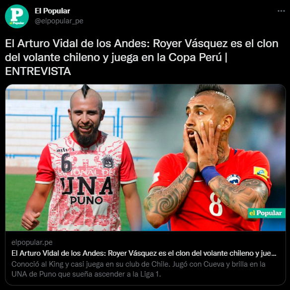 En una entrevista extensa con ‘El Diario Popular’ de Perú, Royer Vásquez, el profesional peruano con parecido total al ‘Rey’ mencionó que tuvo contacto con el astro sudamericano en una llamada: “Un periodista de ESPN que me hizo el contacto con Vidal a través de una videollamada, que fue emocionante. No me lo esperaba. Me preguntó acerca de mí y me hizo algunas bromas”.