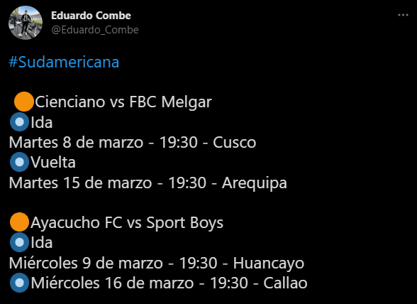 “Cienciano vs FBC Melgar. Ida: martes 8 de marzo – 19:30 – Cusco. Vuelta: martes 15 de marzo – 19:30 – Arequipa”. Eso en principio. Y después, el siguiente cotejo: “Ayacucho FC vs Sport Boys. Ida: miércoles 9 de marzo – 19:30 – Huancayo. Vuelta: miércoles 16 de marzo – 19:30 – Callao”. Solo queda esperar y ver los desenlaces de estos enfrentamientos.
