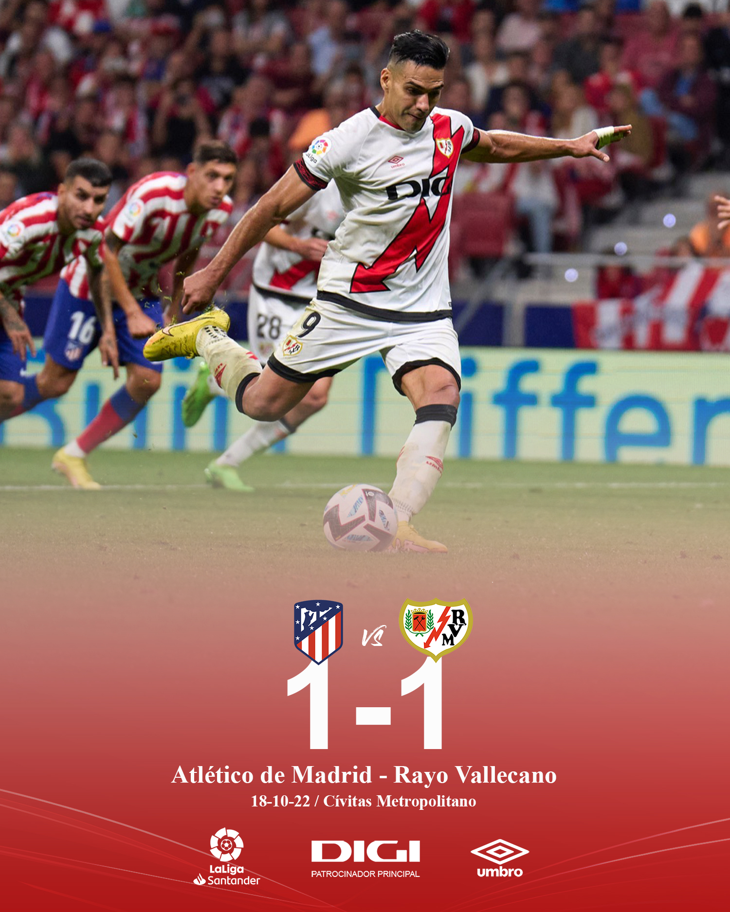 El primer tanto fue obra del dueño de casa, Álvaro Morata, definió bien, demostrando que estaba en el campo, porque casi no había tocado un balón hasta el 20′. Pero las malas noticias para el vecino del Real Madrid llegó a los 90+2′, porque desde los 12 pasos, el crack colombiano, Radamel Falcao venció el pórtico de Jan Oblak. Haciendo aún más viva, la ley del ex.