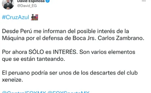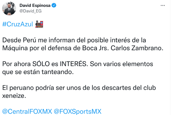 “Cruz Azul ya tendría anotado al que sería su segundo refuerzo de cara al Torneo de Clausura 2022 de la Liga MX, pues una vez que amarraron a Christian Tabó, ahora buscan sumar un defensor y tienen en la mira al zaguero peruano,Carlos Zambrano, actual jugador del Boca Juniors de la Liga Argentina”, señalaron por ejemplo en Soy Fútbol, lo que fue replicado por distintos comunicadores ¡A esperar!